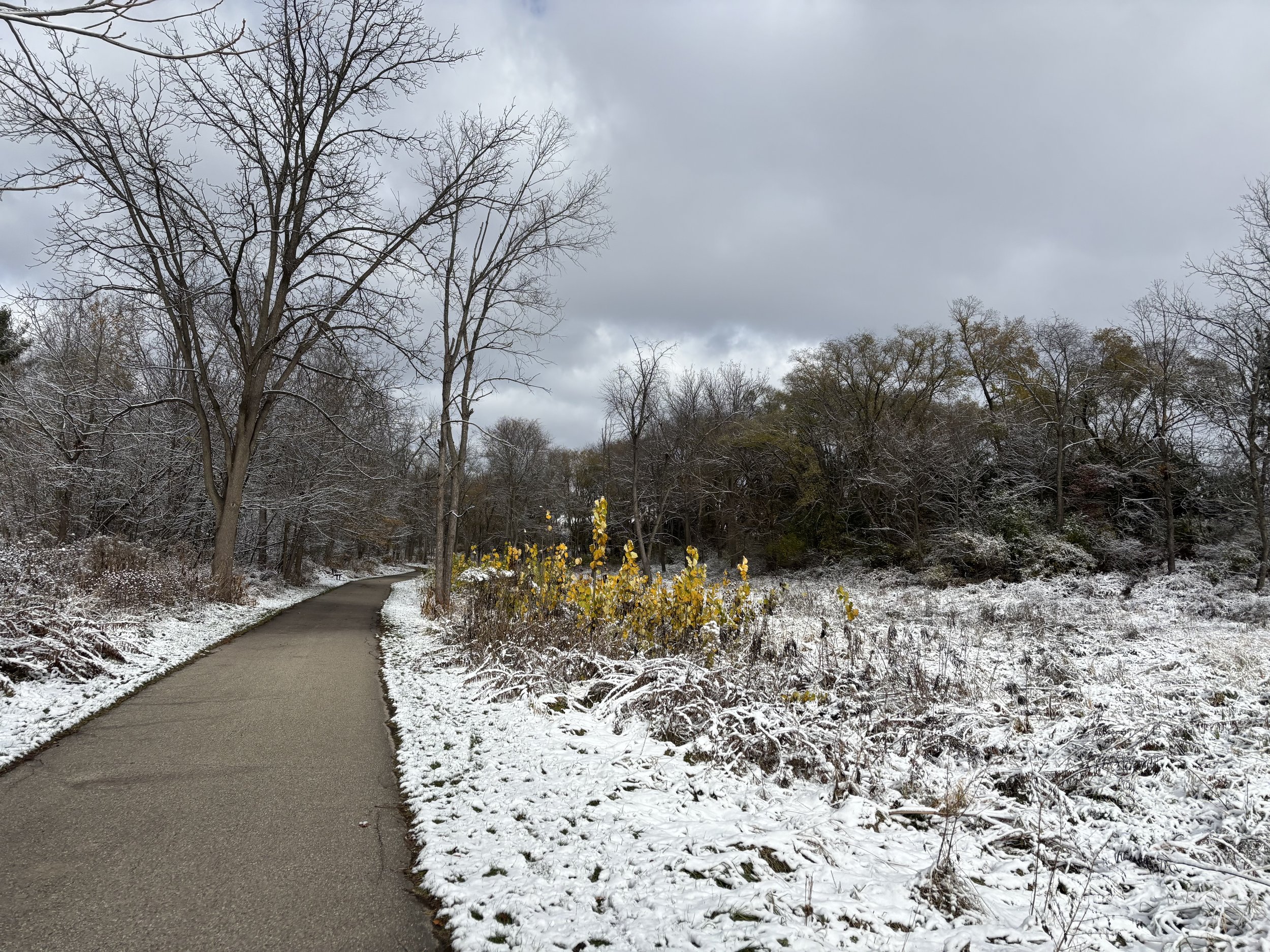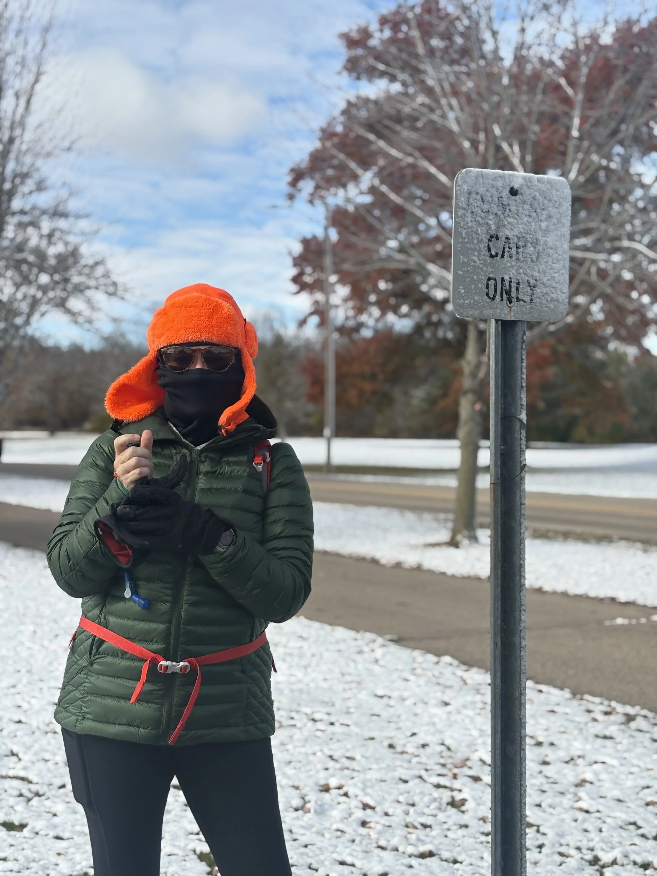 The first (only?) snow of the trail! Today was 33º but with windchill it felt like 11º, or so the weather reported. It felt SO cold without my gloves or face mask, but bundled up I was warm and cozy. Still, I only carved 10 miles of the remaining ~300 before leaving the trail early (before sunset) once I reached Milton. I stopped at a pub and treated myself to cheese curds and a brew from New Glarus. The rest of the week will be much warmer until eventually the temperature returns to the high 50s/low 60s. The weather may just hold…